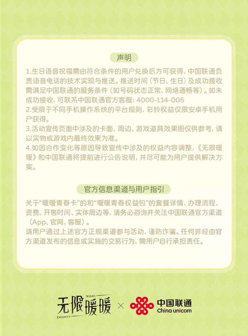 《无限暖暖》×中国联通联名「暖暖青春卡」及「暖暖青春权益包」现已开启预约~《无限暖暖》携手中国联通,与你青春同行,将青春写进画卷,把热爱通向远方。专属电话卡面、定制视频彩铃、联名家园挂饰、暖暖大喵语音祝福......一起来和小编看看吧~