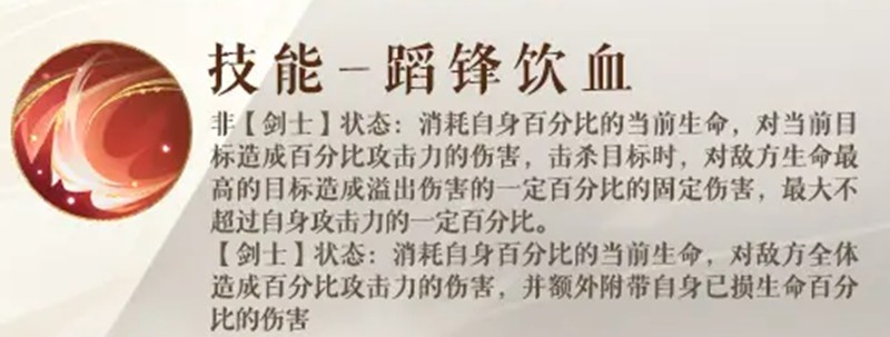 蹈锋饮血这项技能更是将他的战斗风格发挥到了极致。在非【剑士】状态下,凌统会以当前生命为代价,打出强大的攻击力伤害。这个技能最吸引人的地方在于击杀敌人后,还能将伤害溢出到敌方生命最高的目标上,给敌人致命一击。溢出的伤害虽然有限制,但当你一击击杀一名敌人,顺带给敌方最强的那一位补上一刀,这种“横扫千军”的感觉真是爽到爆。而如果他处于【剑士】状态,技能的威力则更上一层楼。不再是单一的攻击,而是全体敌人都得面对凌统的怒火,额外附带的生命损伤简直让敌人无法承受。