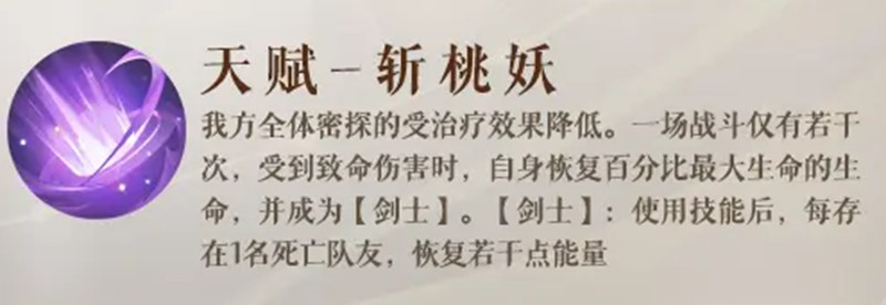 凌统的天赋技能——斩桃妖,则进一步强化了他的战场适应能力。全体密探的受治疗效果降低是个非常有趣的设定,让敌人很难通过治疗手段来扭转局势。最令人惊喜的是,凌统在面临致命伤害时,可以恢复自身最大生命的百分比,并转变为【剑士】状态。这种技能的设计巧妙地弥补了凌统在关键时刻可能遇到的生存问题,并且让他在阵亡队友的数量越多时,恢复的能量越多。这意味着他可以更频繁地使用技能,带领团队走向胜利。