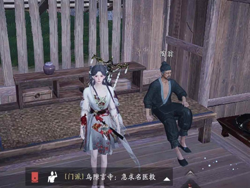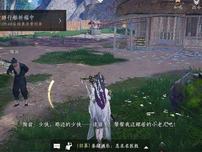 步行跑到陶翁的小屋,我没有加速跑,就是正常速度跑的,等触发屏幕下面一行小字说让我帮帮他的时候(p3),停了一下,然后慢慢到他身边,刚到他身边碰了他一下就触发了。