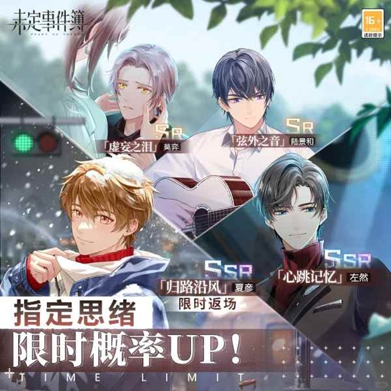 活动期间,轮替女神之影中,夏彦SSR【归路沿风】、左然SSR【心跳记忆】、莫弈SR【虚妄之泪】、陆景和SR【弦外之音】获取概率提升