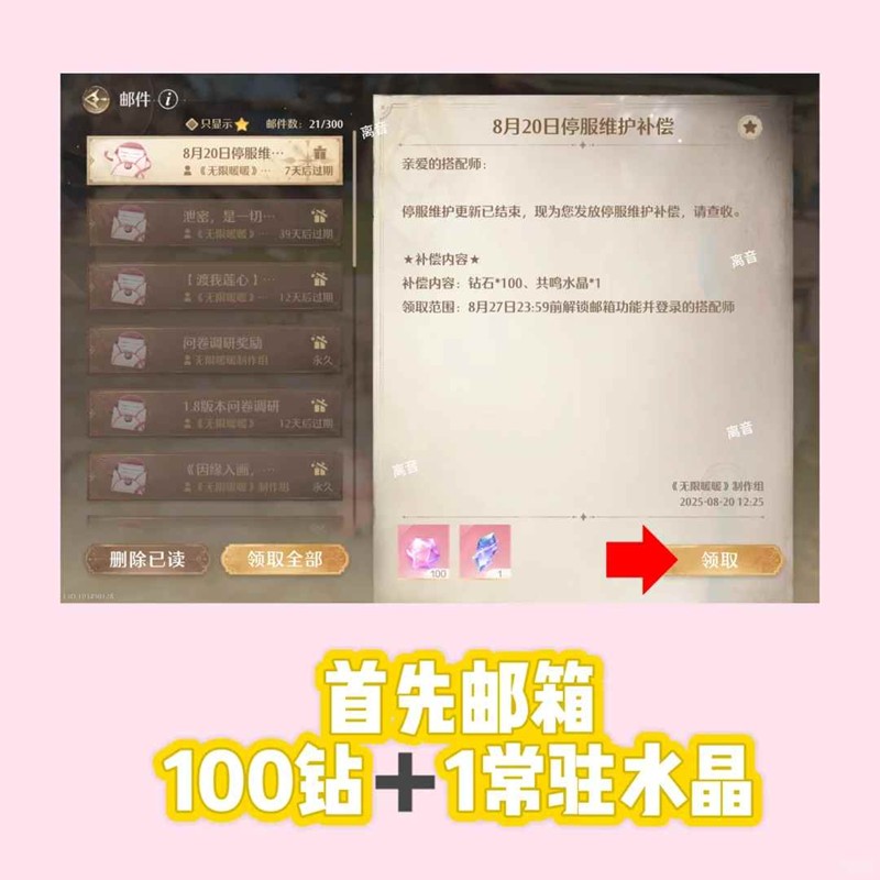 上线,首先去领取一下邮件!100钻!1常驻水晶!