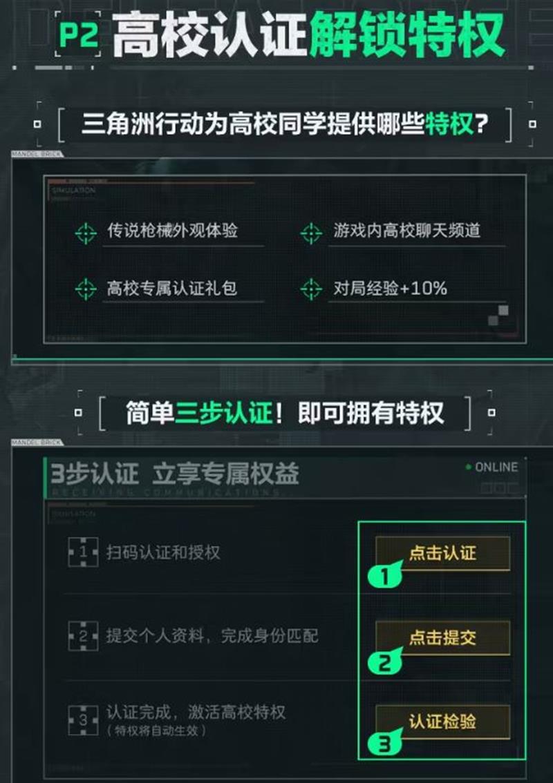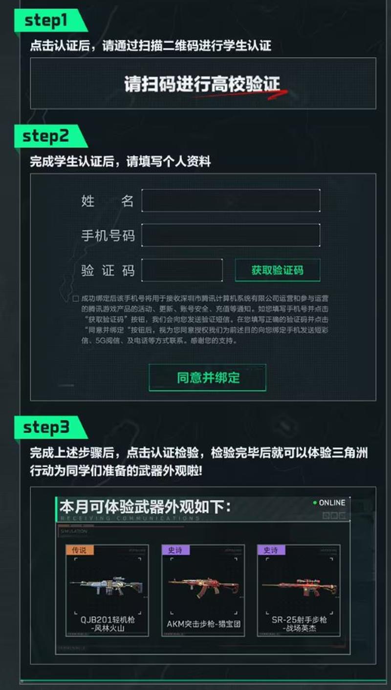 完成高校认证后,您可以解锁包括传说枪械外观体验、游戏内高校聊天频道、高校专属认证礼包以及对局经验+10%等特权。