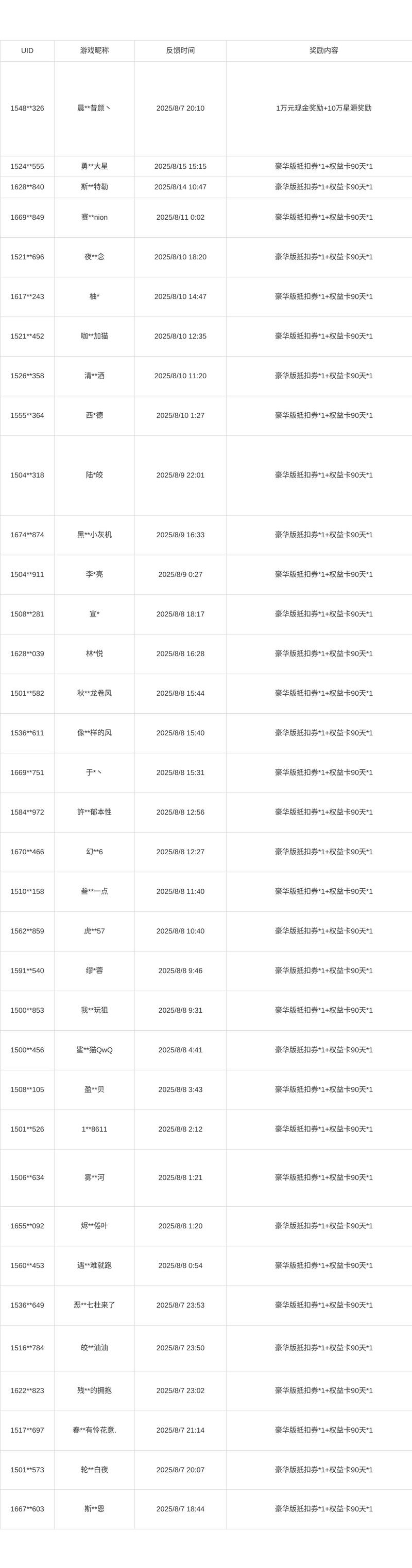 按此前征集公告中提到的奖励,我们将为第一位提交“通过丢弃异常物、中转仓处理,向客服申请异常物补发”方法的玩家,发放1万元现金奖励+10万星源奖励;此外,我们还将为征集公告发布至今(2025年8月23日午12时),所有按悬赏征集格式,通过反馈平台提交有效征集反馈的玩家,发放豪华版抵扣券*1+权益卡90天*1。具体获奖名单如下: