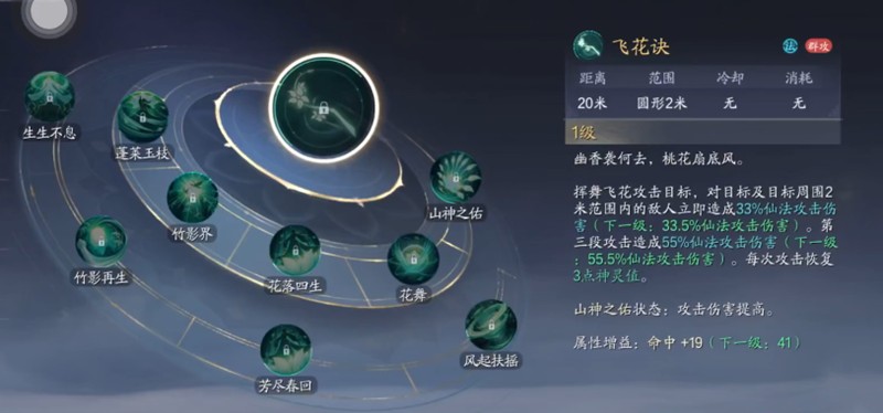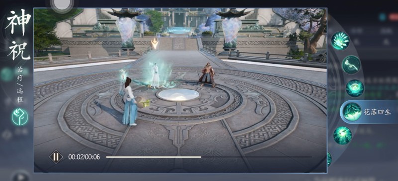 花落四生是神祝的主要单体治疗技能,基于自身仙法攻击力为队友恢复生命值。该技能会自动选择血量最低的队友进行治疗,大大降低了操作难度。在山神状态下进化为芳尽春回,不仅治疗量大幅提升,还会附加持续恢复效果,成为拯救濒危队友的关键技能。