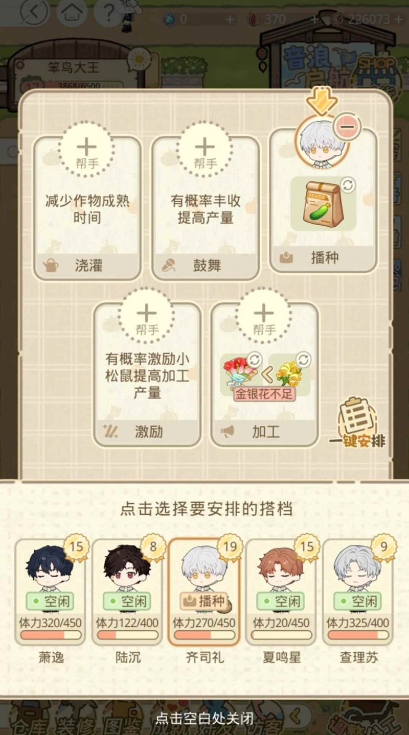 可以只让一个男主来帮你,这样体力花销就会减少很多,最推荐是种菜,等他级别高了,可以一次种四片田,非常快。如果手动种的话,每块田都要点一下