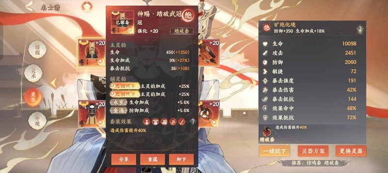 于谦装备方面推荐踏破或者离火,在踏破暴强词条够用的情况下(面板暴强总和达到250+),个人还是更建议选择踏破套,离火主灵韵选择爆抗衣帽,默认鞋配,暴强武器即可。