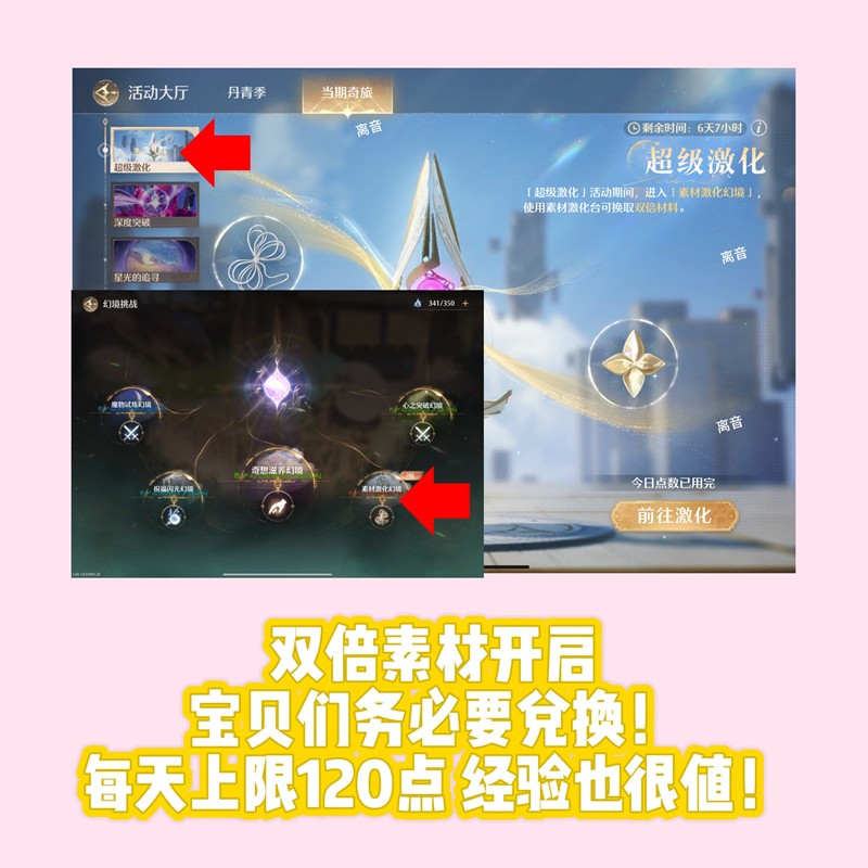 每日双倍素材开启,宝贝们务必换,每天上限120点,双倍经验也要拿!