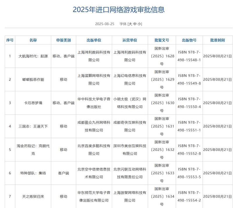 2025年8月25日,中国国家新闻出版署正式公布了最新一批进口网络游戏审批信息,为国内游戏市场注入了新的活力。在这批获得批准的游戏中,共有7款作品脱颖而出,它们不仅涵盖了移动和客户端等多个平台,还包括了备受期待的经典IP续作。