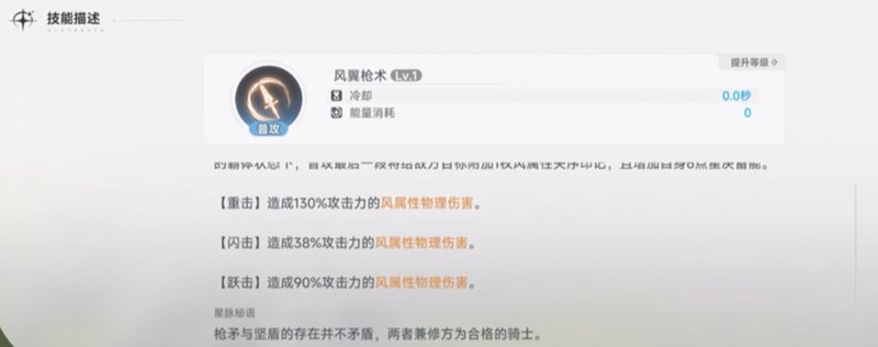 风翼枪术是莉莉的普通攻击技能,能够对敌人进行五段连续攻击,总共造成394%的风属性物理伤害。当莉莉处于霸体状态时使用该技能,最后一击还能为敌人附加风属性失序印记,同时为自身增加6点星决蓄能值。