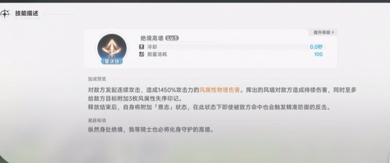 绝境高墙是莉莉的星决技能,能够对敌人造成高达1450%的风属性物理伤害。技能释放期间生成的风墙会对敌人造成持续伤害,并附加3枚风属性失序印记。技能结束后,莉莉会进入意志状态,受到攻击时可触发精准防御效果。