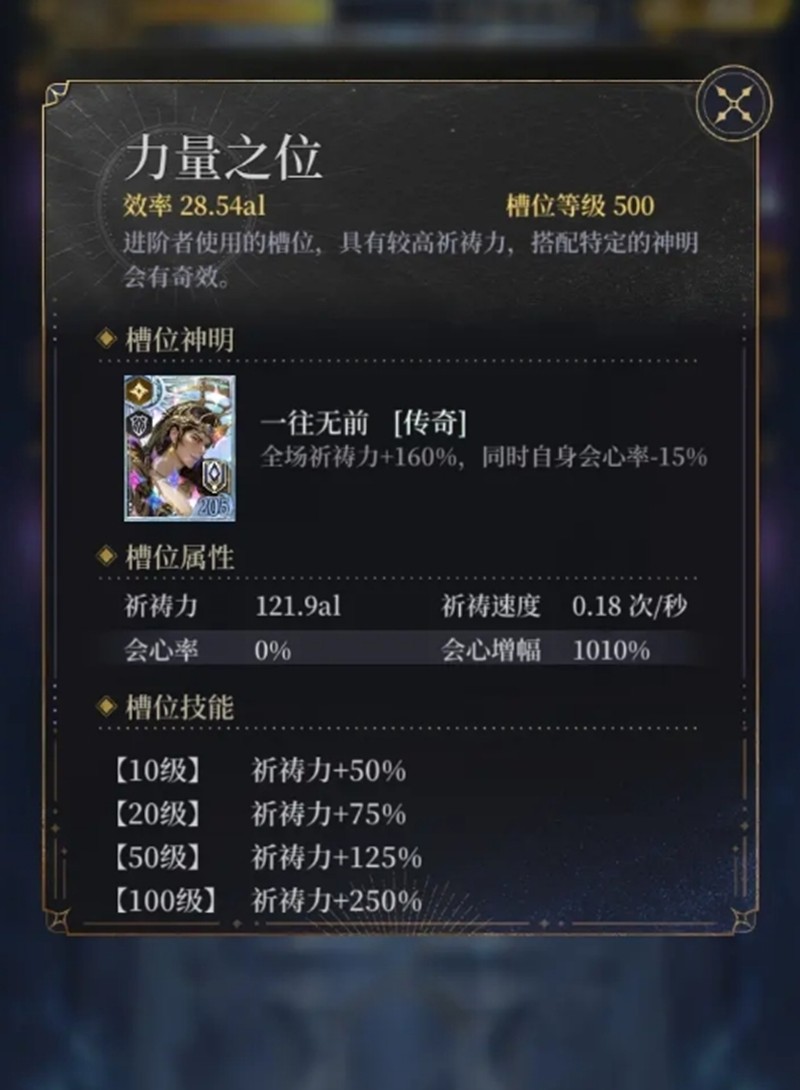 当神龛提升到3级后,会解锁更多实用功能。心之激荡功能可以实现自动点击祈祷,祈祷之力功能则可以提升祈祷效率。同时还会解锁神明槽位,玩家可以放置不同的神明卡来获得各种加成效果,比如提高会心率或增加祈祷力。