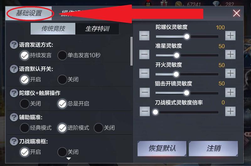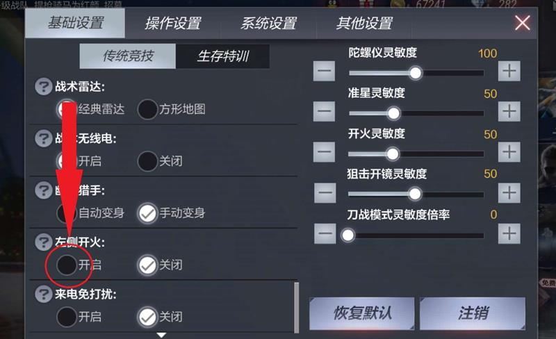 在设置页面中可以看到多个选项,找到并点击"基础设置"选项。在基础设置界面中,分为"传统模式"和"生存特训"两种模式设置,两种模式都需要分别设置左侧开火功能。