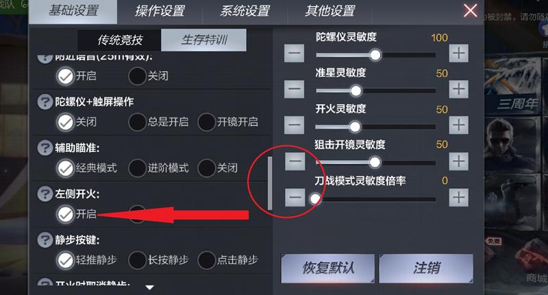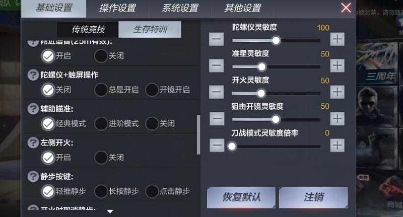 除了左右开火设置外,游戏操作设置对玩家的发挥也很重要。建议将"陀螺仪+触屏操作"选项设置为"总是开启","辅助瞄准"选项设置为"进阶模式"。