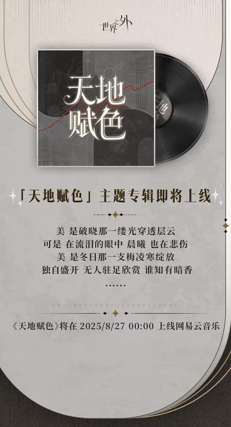 世界之外游戏的特殊副本“天地赋色”主题歌曲《天地赋色》已于8月27日00:00正式在网易云音乐平台上线,玩家可以通过前往网易云音乐歌手「世界之外」的主页收听。