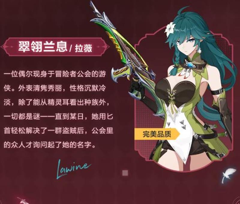 一位偶尔现身于冒险者公会的游侠。外表清贵秀丽,性格沉默冷淡,除了能从精灵耳看出种族外,一切都是谜——直到某日,她用匕首轻松解决了一群盗贼后,公会里的众人才询问起了她的名字。