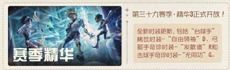 ●本周第三十九赛季·精华3正式开放,全新时装更新,包括“台球手”稀世时装-“自由领袖”D、弓箭手奇珍时装-“发散谱”R和击球手奇珍时装-“无用功”G。在抽取精华次数达到80/130次时,可在【头像】弓箭手-“发散谱”R/【头像】击球手-“无用功”G中任选其一获得;当抽取次数达到180次时,则可获得【头像】“台球手”-“自由领袖”D。