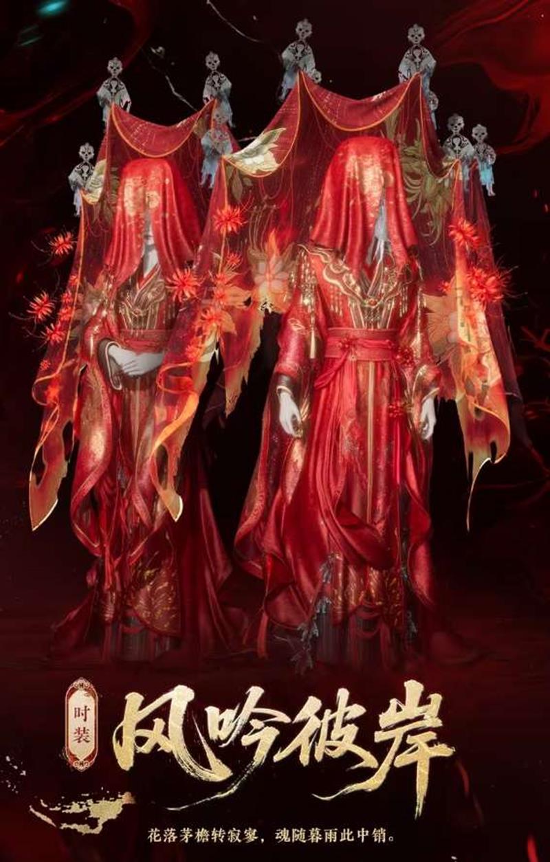 套装中的鲜红嫁衣不仅是对传统婚服的颠覆,更是角色对抗世道不公的战甲。它象征着角色不屈不挠、勇于抗争的精神,衣袍上不见传统的鸾凤图案,而是以金线绣以曼珠沙华,这种花在许多文化中象征着生死轮回,暗示着角色超脱世俗,渡人渡己的悲悯情怀。