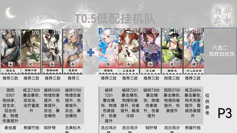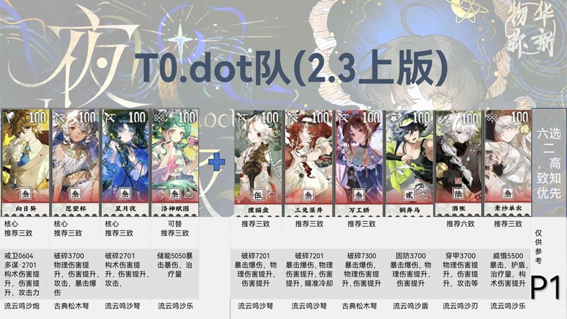 如果星月夜有三致知,可以单走。对群对单输出都比较高。奶妈生存位目前没有特别适配的之后可能会出一个针对性的奶/辅。有三致知三兔的可以用三兔,挂BUFF同时也能兼顾输出。新人的话非常推荐去组该队伍。