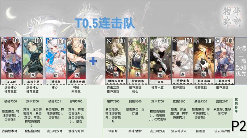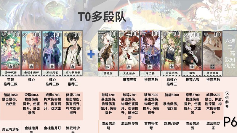 主流玩法,输出爆炸,抗伤能力略低,高难图对策解,金瓯焕彰配上王氏效果还不错,不过彩凤对于多段处于可有可无的存在。不过对于多段队来说还可以再加强。当前环境大大加强。洛神赋图焕彰保障队伍生存同时提高队伍速度和输出适配度特别高。商周加铜座龙【或者6931】可以和前四个搭配来搭配队伍。一定程度上解放队伍限制,对于4+2的地图实现一定程度上解放。
