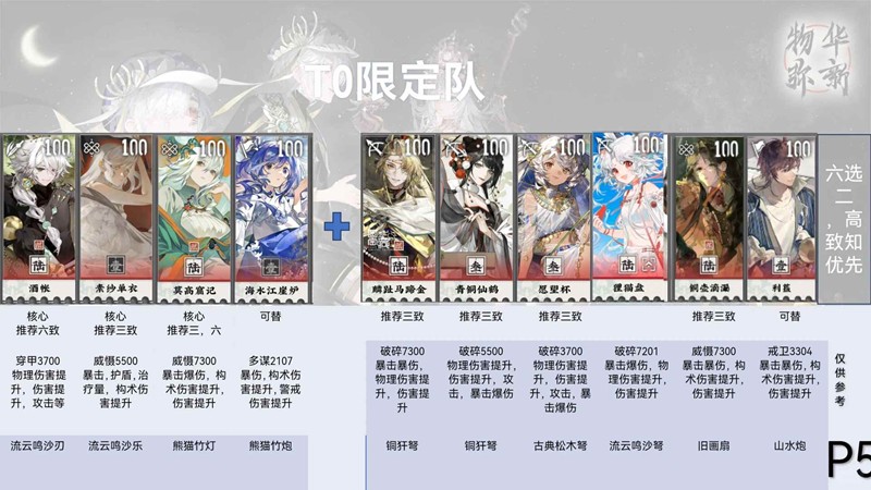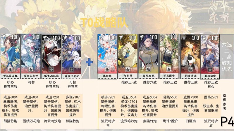 主流玩法,控制输出一体,操作简单,海水江崖炉有的时候需要放到其他队伍,所以白龙鸟音等都可以,建议带一名远击对策远程,百花可以提高队伍伤害,铜壶其实不如书记在队伍里面提升,真珠可以提高队伍生存,适配效果嘎嘎爽。战略异变用了都说好,6-22对策配队。洛神赋图焕彰保障队伍生存同时提高队伍速度。