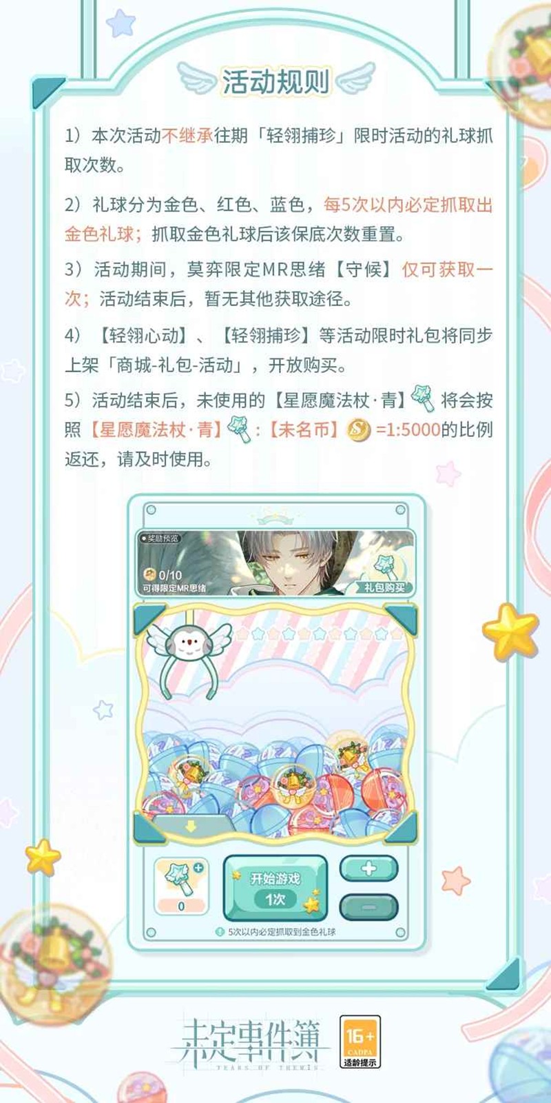 活动期间,律师可通过购买活动限时礼包或消耗【未名晶片】获得的【星愿魔法杖·青】抓取各色礼球。每个礼球将在抓取后自动转化为【女神之泪】、【未名晶片】、升级素材道具等随机奖励;累计抓取10个金色礼球即可获取莫弈限定MR思绪【守候】