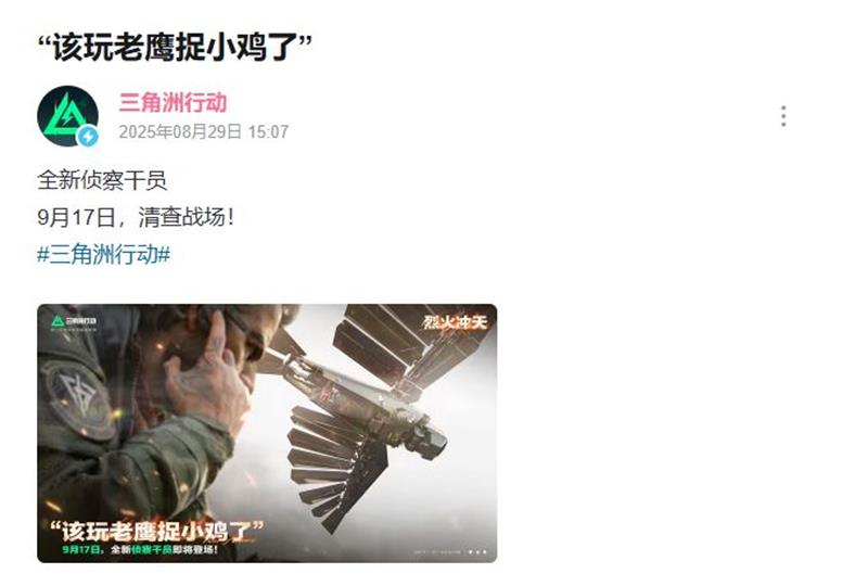 我们可以看见,全新干员将于 9月17日登陆游戏,除此之外官方还爆料一张截图,可见全新干员是一位男性角色。道具则是一只机械鹰~