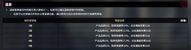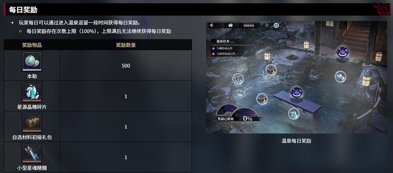 温泉系统的基础功能是提供稳定的资源获取渠道。玩家每日进入温泉并停留3分钟即可领取100%的奖励,包括本勒、星源晶魄碎片、自选材料初级礼盒和小型星魂精髓等实用道具。奖励品质与娱乐室等级直接挂钩,等级越高,产出的资源数量和稀有度也随之提升。1级温泉仅提供基础奖励,而5级温泉则能额外增加20%的陷阱规避率和点击激励效果,大幅优化资源收集效率。建议优先将娱乐室升至3级,以解锁LV3品质奖励和15%的陷阱规避率,为后续玩法奠定基础。