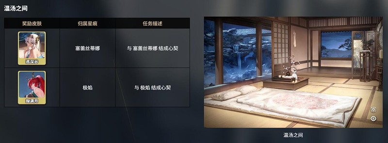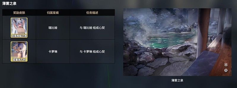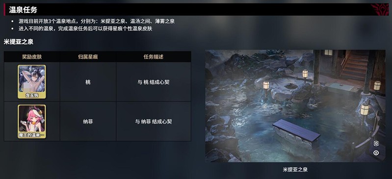 温泉系统中包含三大特色温泉地点:米提亚之泉、温汤之间和薄雾之泉,每个温泉对应不同的星痕角色及任务要求。例如,米提亚之泉与桃、纳菲相关,玩家需与她们缔结心契才能解锁含玉钩和魔王请帖皮肤。心契解锁流程分为两个阶段:首先需通过战斗协同或赠送礼物(如七色铃兰、千纸鹤)将星痕好感度提升至5级,随后在温泉场景中触发专属剧情,选择正确对话选项即可完成心契。解锁的皮肤可在星痕-外观界面自由切换,部分皮肤还能提供战斗中的属性加成。