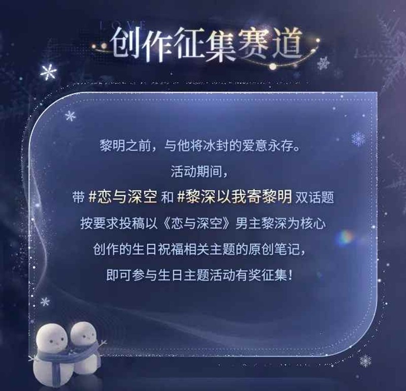 带 #恋与深空 和#黎深以我寄黎明 双话题,以《恋与深空》男主为核心,按要求投稿以《恋与深空》男主黎深为核心创作的生日祝福主题相关的原创笔记,即可参与生日主题活动有奖征集!