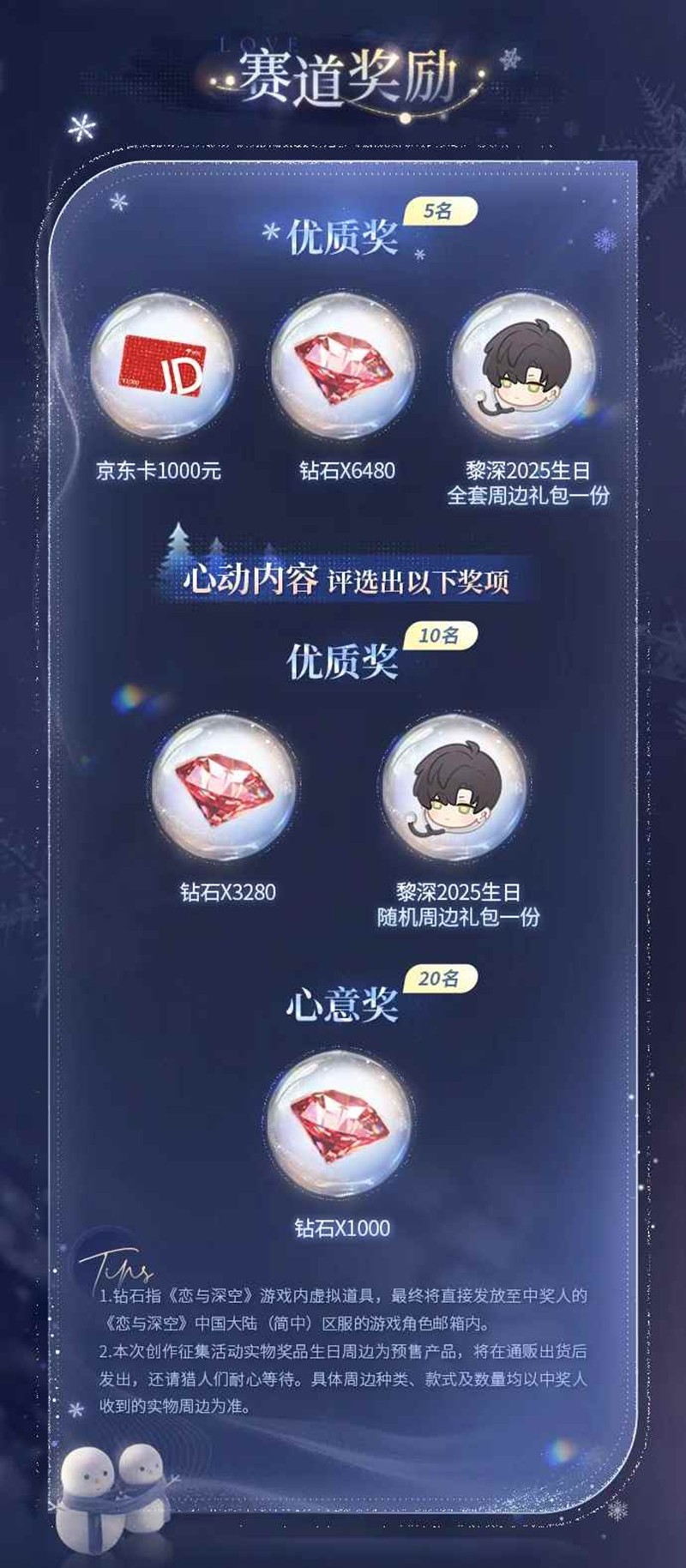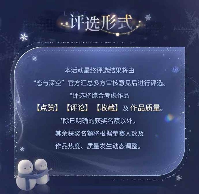 本活动最终评选结果将由“恋与深空”官方汇总多方审核意见后进行评选。“评选将综合考虑作品【点赞】【评论】【收藏】及作品质量。“除已明确的获奖名额以外,其余获奖名额将根据参赛人数及作品热度、质量发生动态调整。