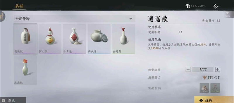 3.其他体力剩余,打开炼药炉,做逍遥散。