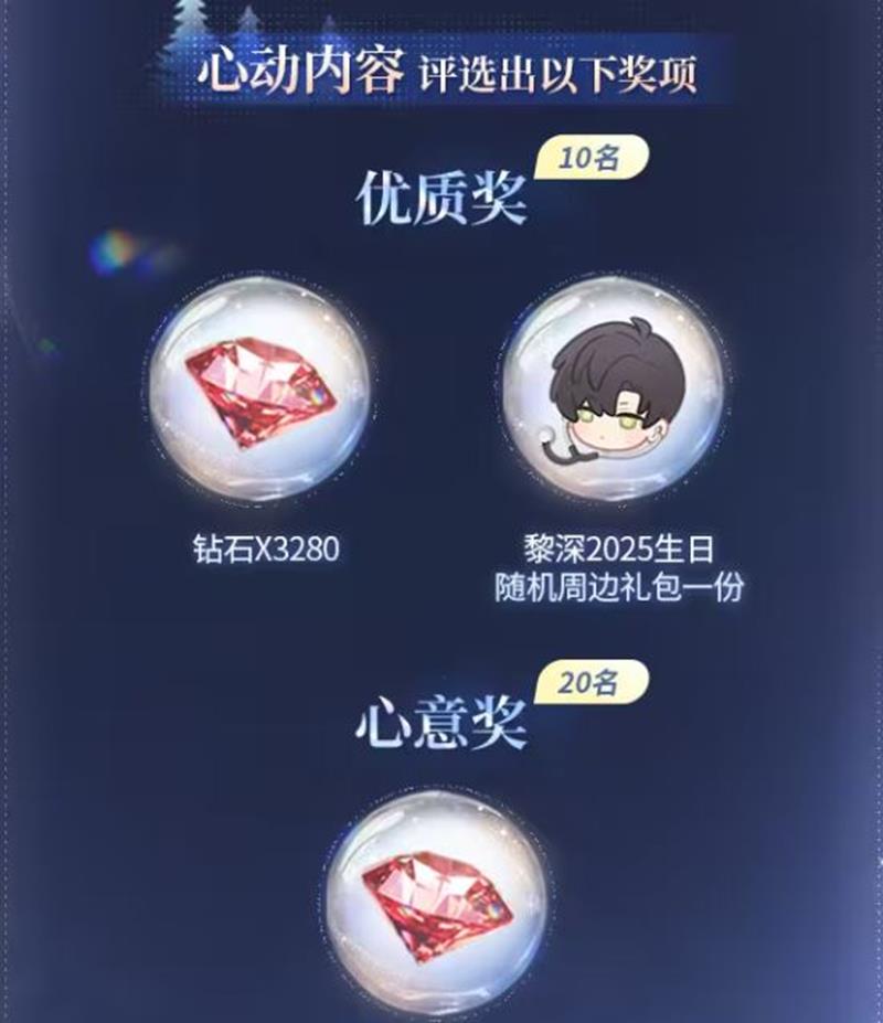 本次活动的最终评选结果将由《恋与深空》官方汇总多方审核意见后进行评选。评选将综合考虑作品的点赞、评论、收藏以及作品质量。除已明确的获奖名额外,其余获奖名额将根据参赛人数及作品热度、质量发生动态调整。