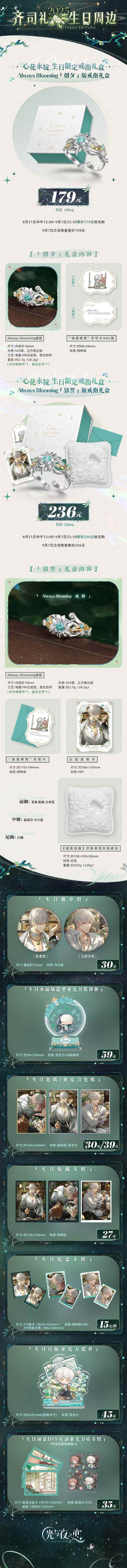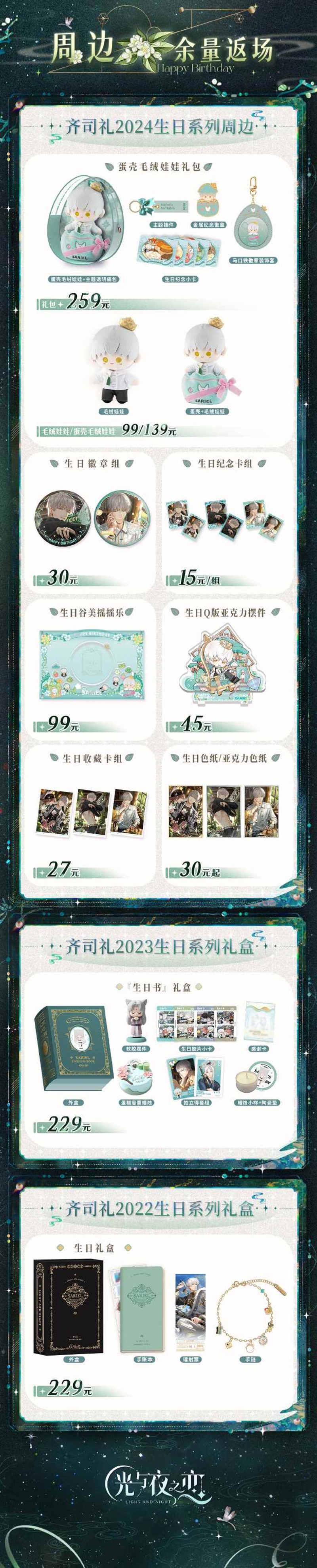◆ 齐司礼2024生日蛋壳毛绒娃娃礼包、生日毛绒娃娃/蛋壳娃娃、生日Q版亚克力摆件、生日徽章组、生日色纸/亚克力色纸、生日摇摇乐、生日收藏卡组和生日纪念卡组,齐司礼2023生日书礼盒和2022生日礼盒,返场时间8月31日中午12:00,数量有限,售完为止。