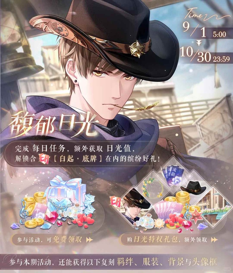 恋与制作人白起·底牌即将上线,恋与制作人馥郁日光:完成指定任务,领取含ER在内的缤纷奖励!活动期间,完成游戏【每日任务】,除活跃度外,还能在馥郁日光活动中获得等量的【光照值】。一起来和小编看看吧~