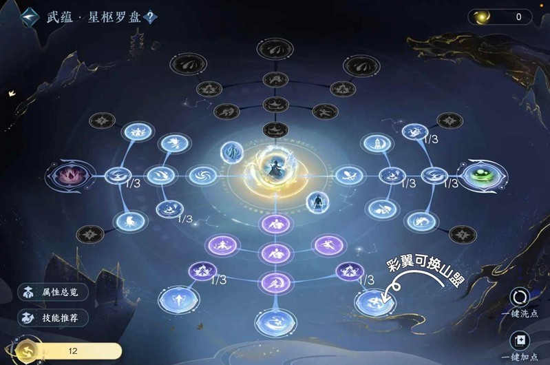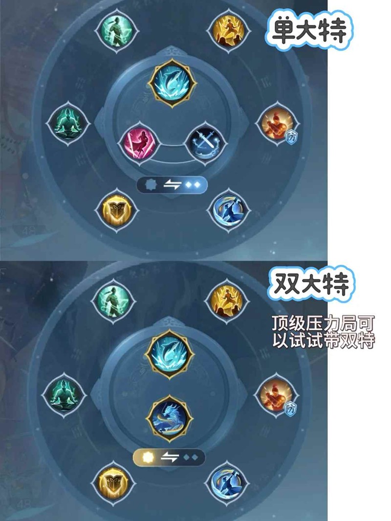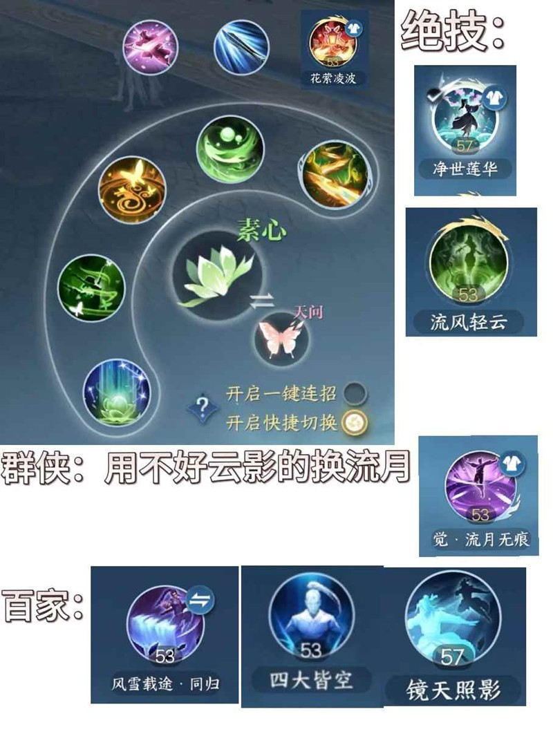 技能:双奶约定换落霞或者山盟,绝技可以带新绝技莲花
