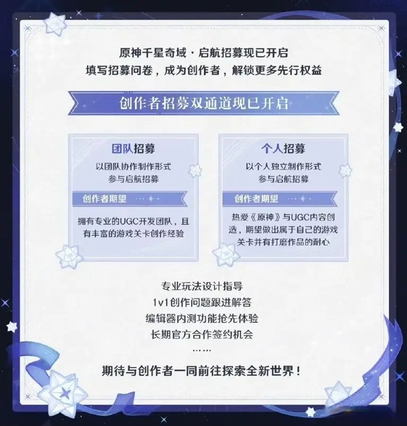 总的来说,“千星奇域”的启航招募是《原神》在UGC玩法上的一次重要尝试。它不仅为创作者提供了强大的工具和支持,也为玩家带来了更多的游戏乐趣。相信在不久的将来,“千星奇域”会成为《原神》中一个充满创意和乐趣的新天地。
