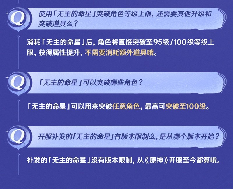 90级升至100级共需3枚无主的命星,其中90→95级用1枚,95→100级用2枚。无主的命星只能由五星角色满命后再溢出获得,每溢出1个命座自动兑换1枚;周年庆常驻五星自选或砺行修远活动中若选到已满命五星,也会当场补发。版本更新前已溢出的五星命座,系统同样会一次性补发无主的命星。道具到手后,任何达到90级的角色(含四星)都能直接消耗命星升级,无需再付摩拉或经验书。