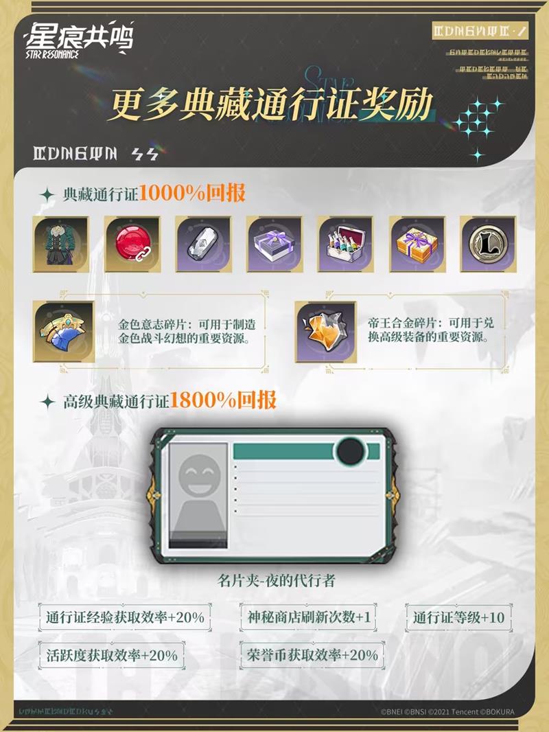 对于追求更高回报的玩家,高级典藏通行证提供1800%的回报。除了丰富的资源,还包括名片夹-夜的代行者,提供额外的通行证经验获取效率、活跃度获取效率、神秘商店刷新次数、通行证等级和荣誉币获取效率的加成。