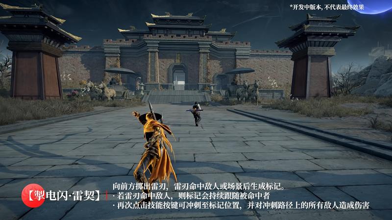 万雷铸身·锋:召唤【雷主】形象,体力迅速恢复至满值,技能动作与【万雷铸身】一致,但有新的战斗机制。雷主持续时间内,战斗技能被替换为投掷【万雷枪】,再次按下技能键,雷主会瞬间移动到万雷枪位置发动坠击攻击。若命中带【雷痕】的敌人,可触发【雷诛】处决。万雷枪击中地面后,队友可协作操作,重复投掷发挥更强战术效果。