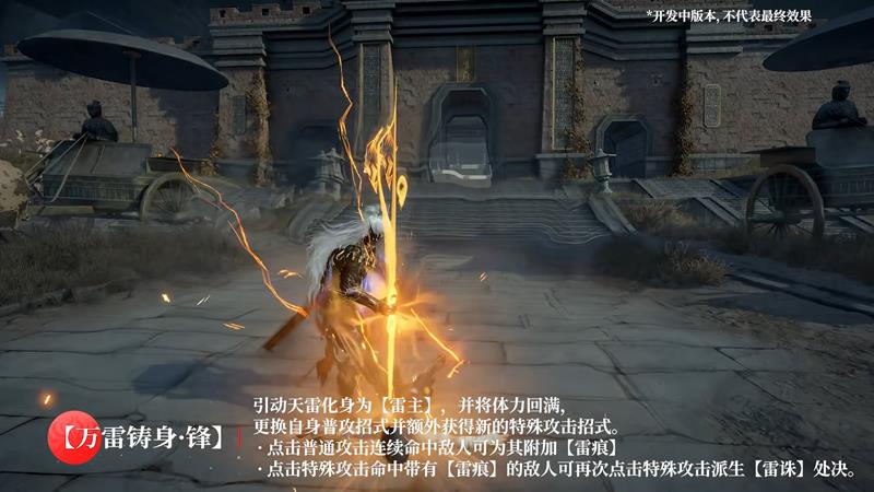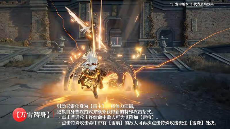 万雷铸身:激活后引动雷电化身为【雷主】,体力迅速恢复到最大状态,获得全新的攻击模组,其威力与装备武器的品质紧密相连。玩家可通过普攻在敌人身上积累【雷痕】效果,使用特殊攻击命中带【雷痕】的目标,触发【雷诛】处决动作,造成更高伤害或获得特殊奖励。击败敌人完成处决后,在【雷力充沛】状态恢复前,无法为对手施加【雷痕】效果。