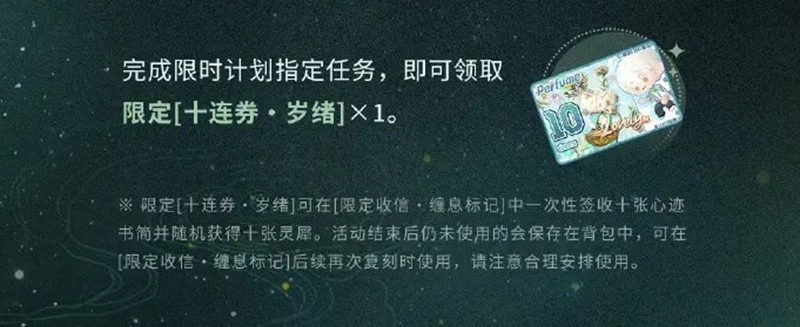 完成指定庆生玩法,玩家能收到齐司礼的信笺“清笺寄思”,这是一份珍贵的留念。而完成限时计划指定任务后,玩家就能拿到活动专属头像框“清风花引”。此外,完成限时计划指定任务还能领取限定“十连券・岁绪”,它可以在“限定收信・缠息标记”中一次性签收十张心迹书简,随机获得十张灵犀,活动结束后没用完的会保存在背包,后续依然有用。