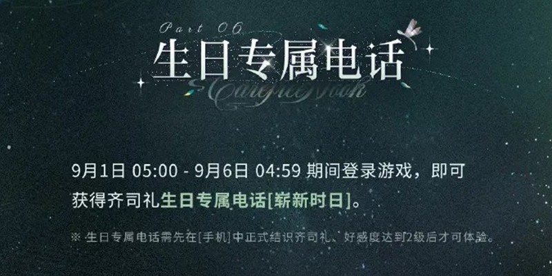 9月1日05:00至9月6日4:59期间登录游戏,玩家能接到齐司礼生日专属电话“崭新时日”,不过需要先结识齐司礼,并且好感度达到2级后才能体验。