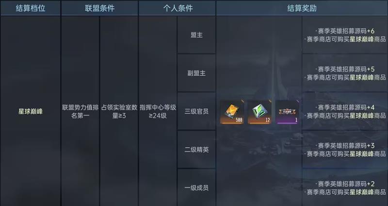 星球巅峰:解锁星球巅峰商品购买权限,至少占领3座实验室时所有成员均可领取【联盟-个人奖励】,成员至盟主分别可获得2~6个招募源码,未满足实验室要求则普通成员无法领取,其余官员可获得1~4个招募源码。