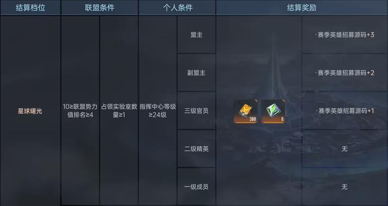 星球荣耀:第二档位,需满足联盟势力值排名进入前三,之后根据联盟所占实验室数量划分为3个小档位,不同小档位奖励内容相同,但招募源码与信用点会略微减少。