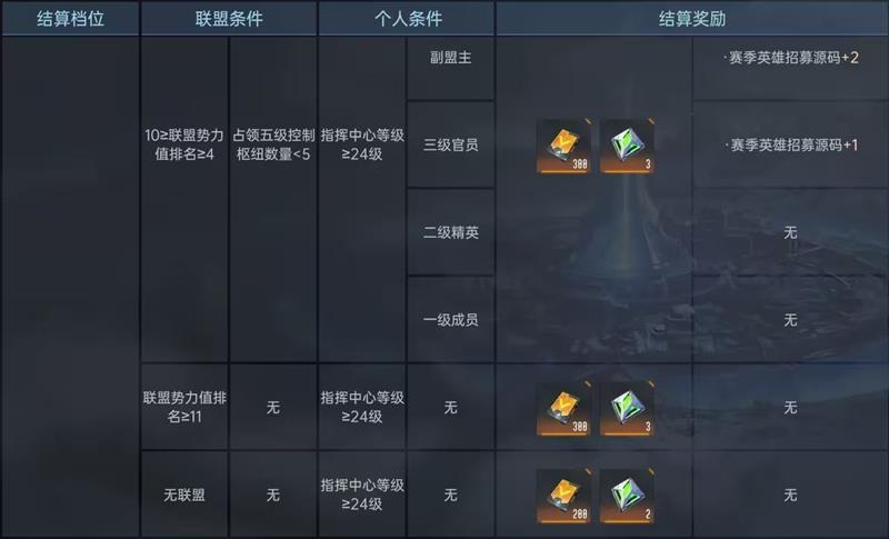 无联盟或联盟未进入势力榜前十,只要指挥中心达到24级也可领取一份结算奖励,但不包含【联盟-个人奖励】。