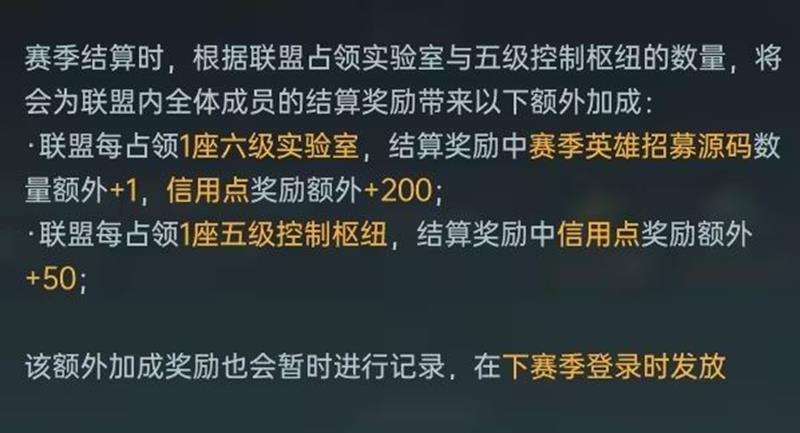 联盟每额外占领一座实验室,赛季结算卡包招募次数+1;联盟每额外占领一座实验室,信用点奖励+200;