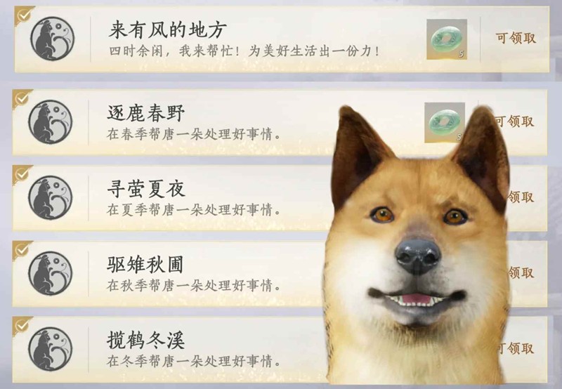 每个季节都有一个成就,找到不同季节的唐一朵(红圈位置)后跟着任务指引走,最后把物品投喂给狗狗“默默”就能完成。