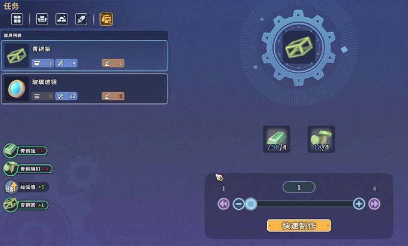 在成功制作出【玻璃】之后,玩家需要将材料送入【磨钻机】和【加工台】进行进一步处理,从而得到【青铜管】。这两个设备的等级必须达到中级以上才能进行有效加工,否则无法顺利产出所需材料。如果设备未升级,可以前往沙石镇协会找到NPC【海蒂】,通过支付金币来提升设备等级。完成这些准备工作后,玩家就可以开始制作【玻璃透镜】了,整个过程需要两个【青铜管】和四个【玻璃】作为基础材料。