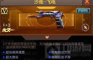 在前阶段CF手游上架的手枪,沙鹰飞电在杠杆上架就有很多土豪玩家直接买下它了,因为在挑战模式、生化模式中无限后备子弹是一个非常实用的功能。沙鹰飞电在战斗中不会感觉这是一把虚有外表的手枪,一把沙鹰飞电打团队或是个人战都可以当步枪来用了。